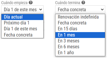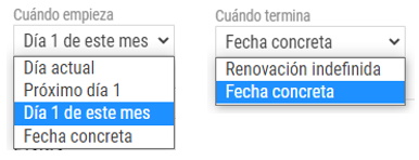 Si la tarifa aplicada en al abono es un importe fijo, las opciones de “Cuándo empieza” y “Cuándo termina” tienen que ser “Fecha concreta”.